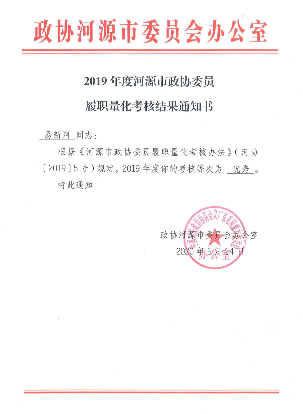 積極建言獻(xiàn)策、認(rèn)真履行職責(zé),易新河董事長在2019年度河源市政協(xié)委員履職量化考核中被評定為“優(yōu)秀”等級。