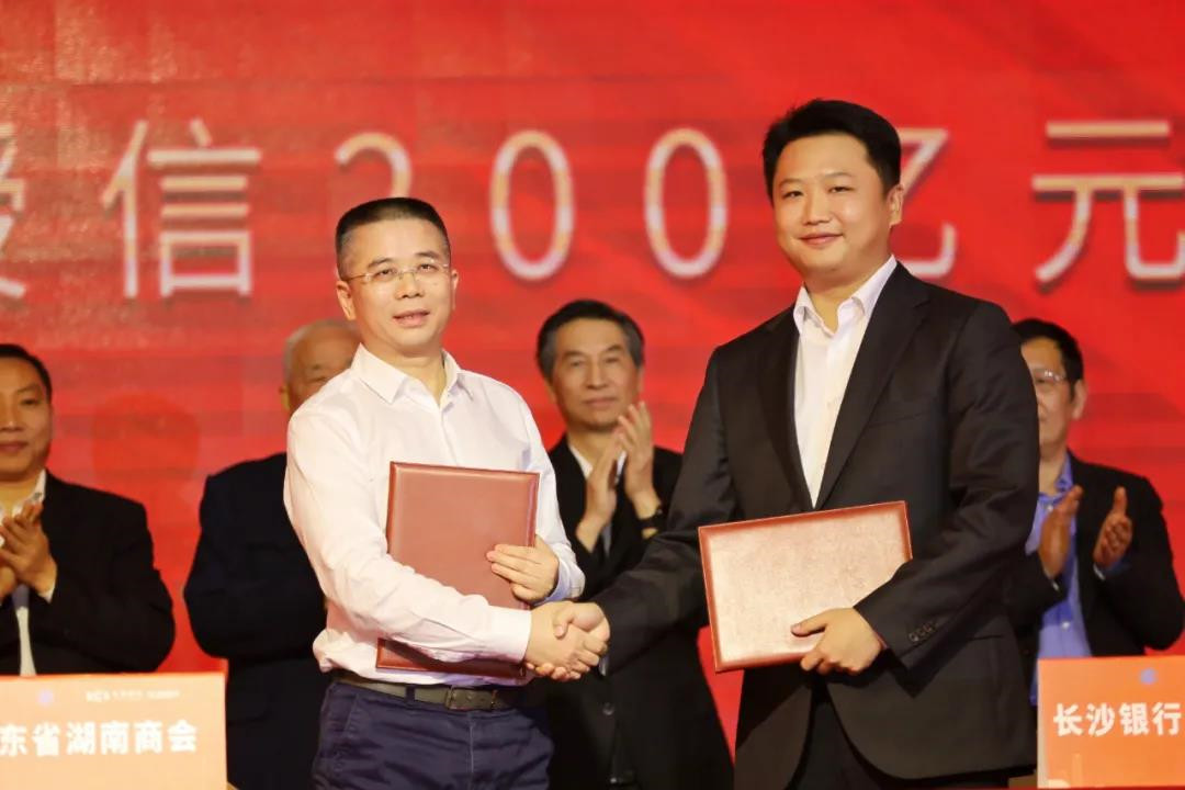 在廣州軍區副司令員、中將宋文漢,湖南省人大常委會原副主任蔡力峰,廣東省人大常委會原副主任肖志恒,湖南省委統戰部副部長、省工商業聯合會黨組書記陳瀟,湖南省人民政府駐深圳辦事處主任熊方平,長沙銀行董事長朱玉國,長沙銀行副行長張曼的見證下,長沙銀行廣州分行行長羅剛與廣東省湖南商會會長陳樂田簽訂了戰略合作協議。本次簽約,雙方本著“優勢互補、互利誠信、相互支持、共謀發展”的原則,建立全面戰略合作關系,長沙銀行廣州分行將為商會優質企業發展、中小企業融資提供200億元意向綜合授信額度,進一步提供優質金融服務、注入重要源頭活水。
