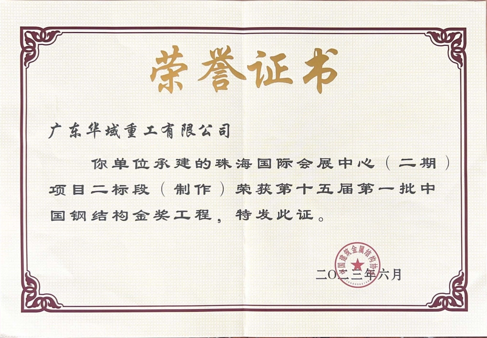 近日,2023年全國建筑鋼結構行業大會在上海舉行。大會向第十五屆“中國鋼結構金獎”獲獎工程單位頒發了榮譽證書,華域重工憑借珠海國際會展中心(二期)項目二標段獲得制作類“中國鋼結構金獎”殊榮。