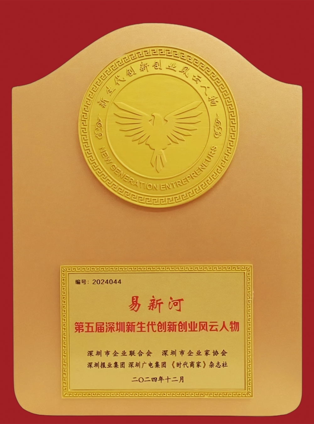 5月28日,深圳企業家前瞻峰會暨第五屆新生代風云人物頒牌盛典在深圳大學麗湖校區隆重舉行。易新河董事長再度登臺,從頒獎嘉賓手中接過了這份象征深圳創新創業精神和深圳新一代企業家精神風貌的榮譽金牌!
