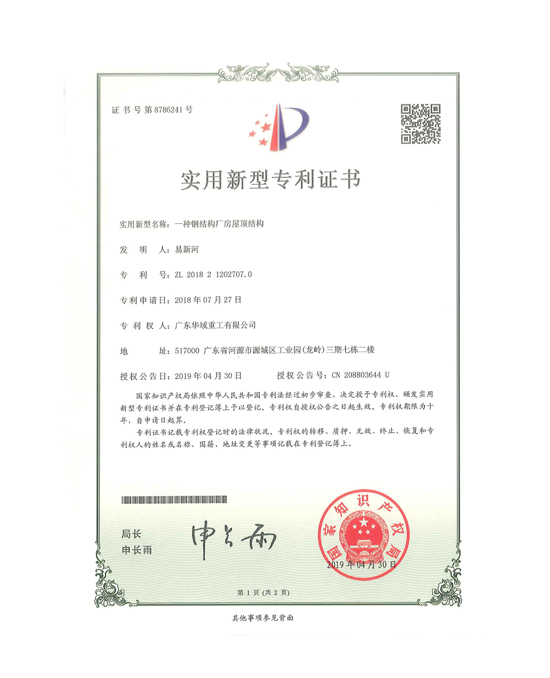 一種鋼結構廠房的屋頂結構專利證書