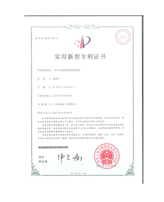 實用新型一種人行通道用新型鋼結構2017專利證書