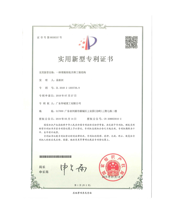 埋弧焊機升降工裝結構專利證書